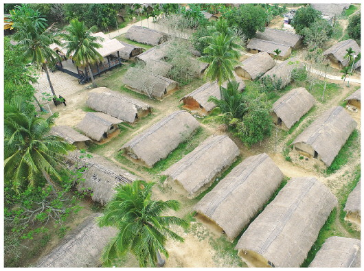 早在远古时代,黎族同胞就在这块土地上刀耕火种,独特的民族文化和绚丽的织锦工艺著称于世,民风质朴、敦厚。黎族同胞主要聚居在五指山区地势较平的山麓或临河的盆地,村寨大小不等,错落有致。 低矮的茅草房掩映在严严实实的椰子树与槟椰树间,在树的空隙处有用竹篱笆围成的小地方,各色蔬菜娇嫩欲滴,清澈的小溪淙淙流过房前,让人有”走进山间别 墅”的感觉。槟椰是黎胞走亲访友的贵重礼物,以数目多小表示情意的厚薄。