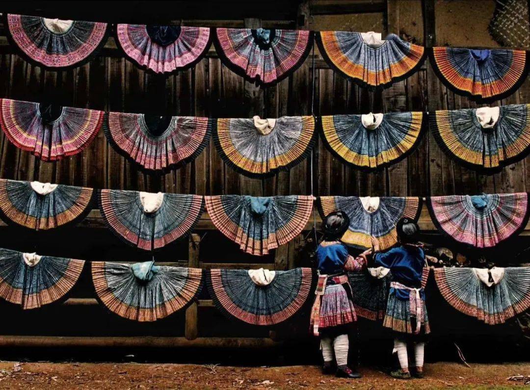 【 蜡染 】是苗族古老的印染工艺,用蜡刀蘸蜡液于白布上绘图,再浸入蓝靛缸染色,然后水煮脱蜡,即显出蓝底白花纹布。